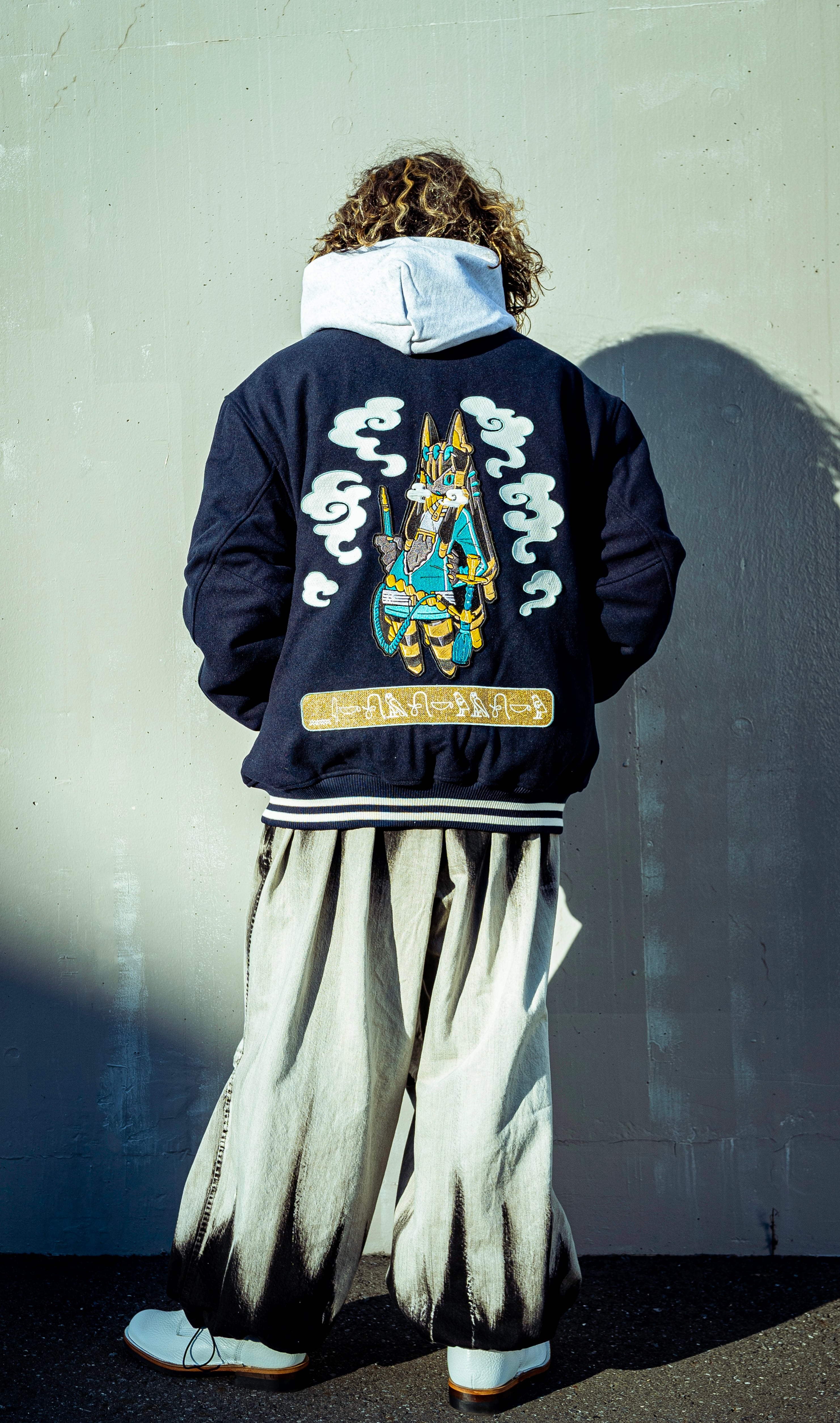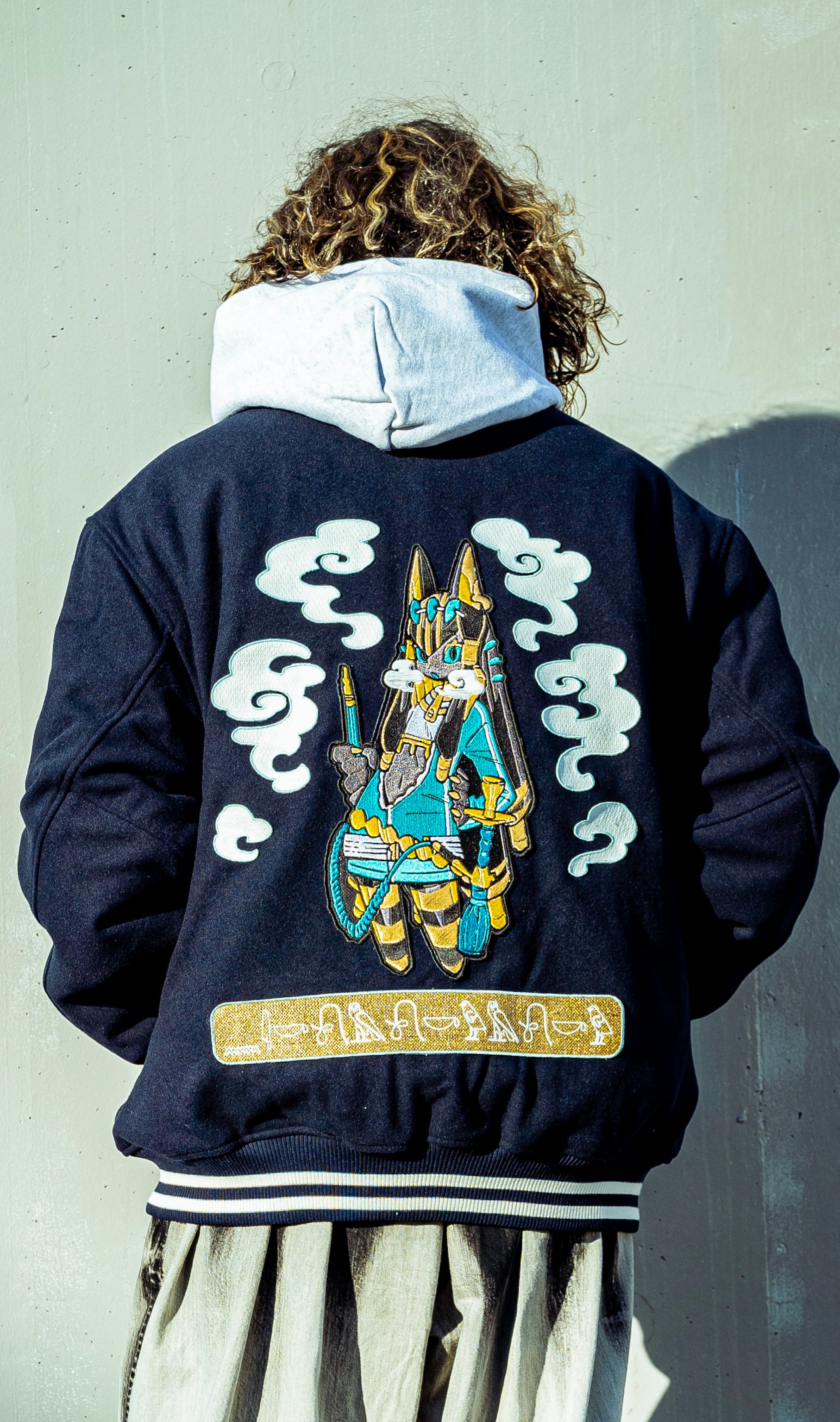 this stadium jacket features exquisite embroidery of the Egyptian-inspired Shisha Nekochan.
