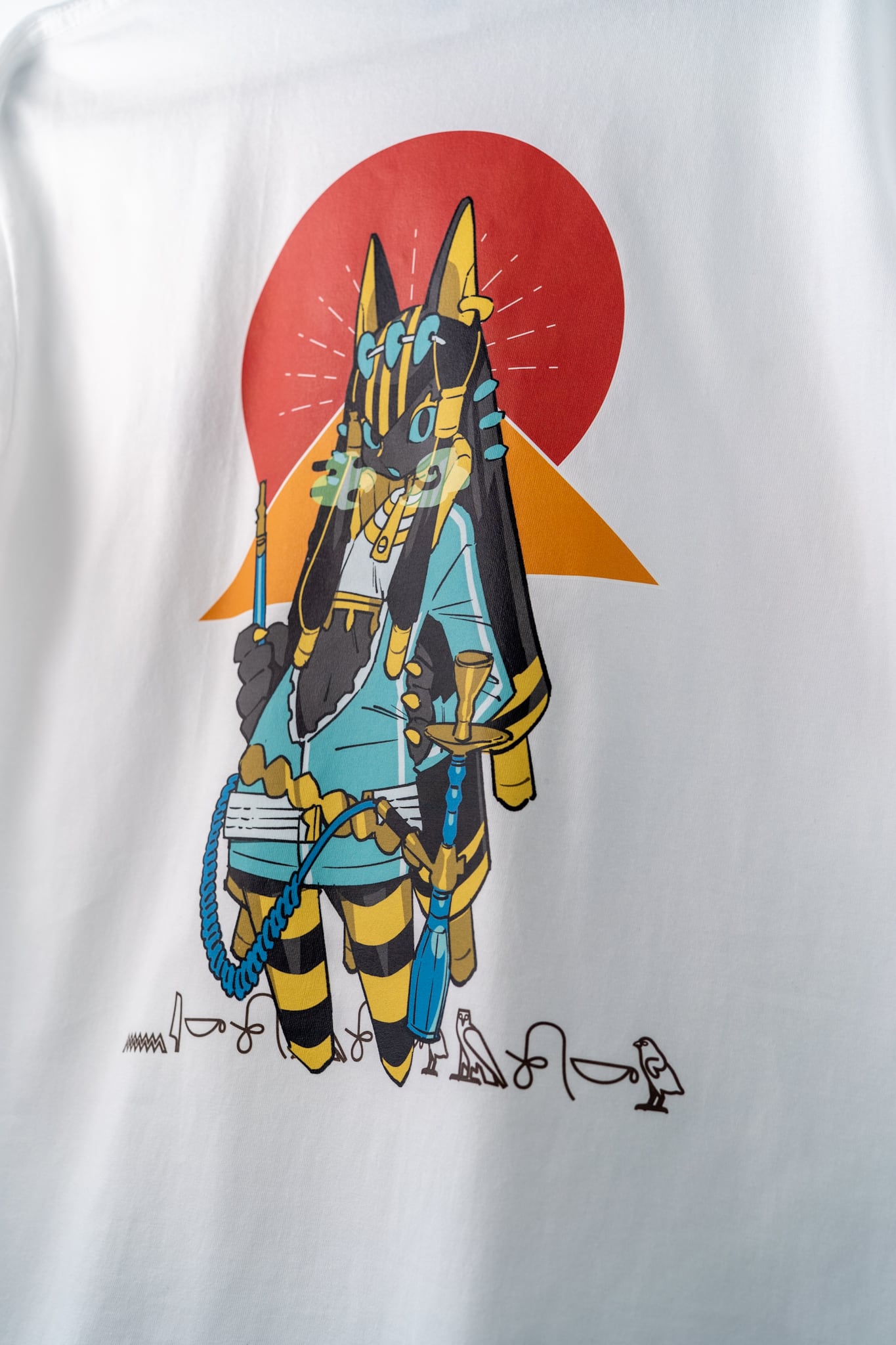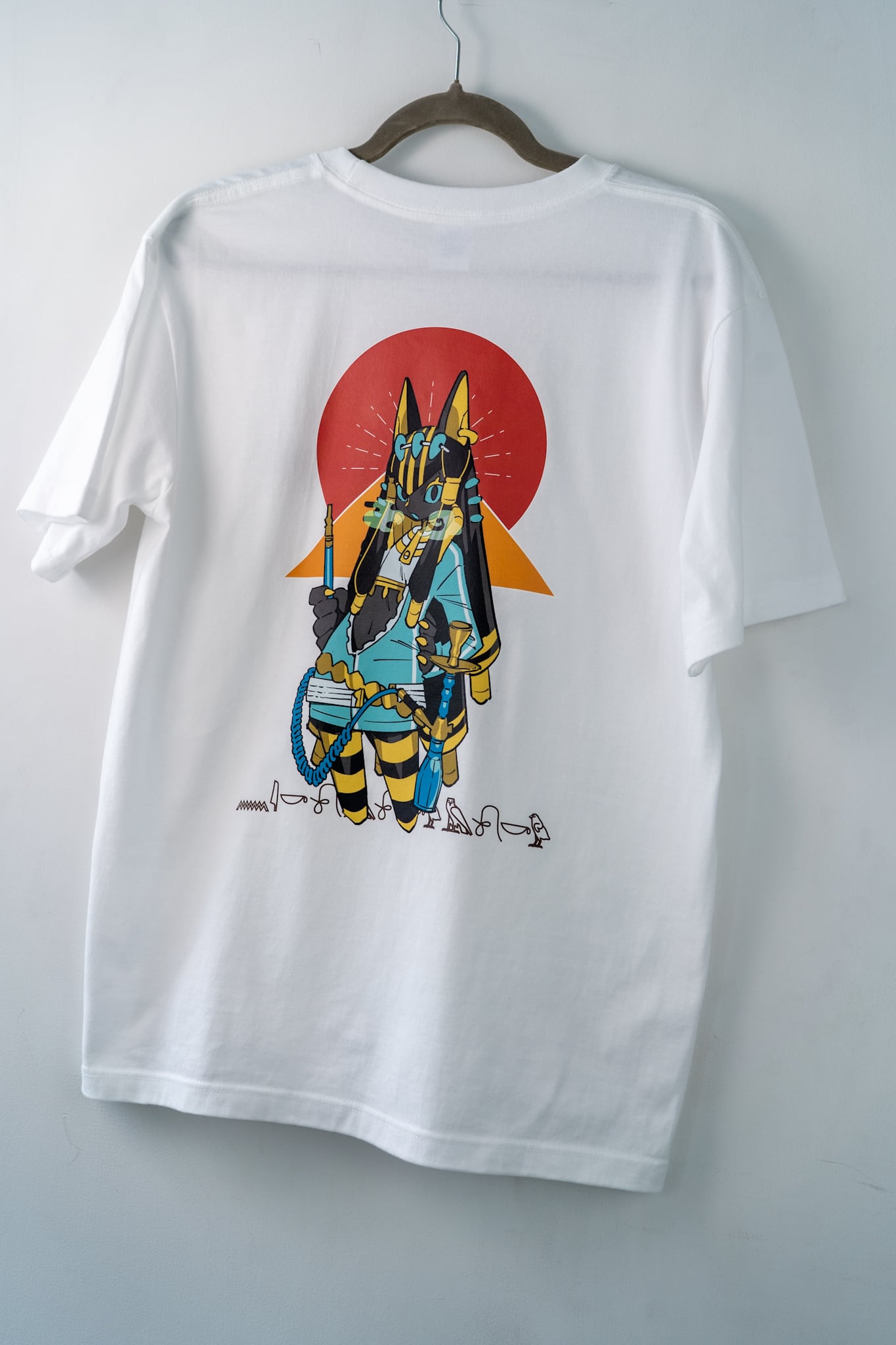 This cut-and-sew piece features an Egyptian-inspired, mysterious illustration by manga artist and illustrator Samejima Suisan, combined with full-color printing and embroidery.
